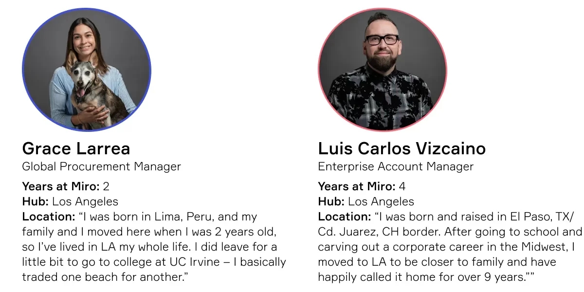 Every year from Sept 15-Oct 15, the Somos Miro employee resource group leads Miro in celebrating the histories, cultures, and contributions of people whose ancestors came from Spain, Mexico, the Caribbean (e.g. Cuba, Dominican Republic, Puerto Rico), and Central and South America. Today, 4 of the ERG’s leaders share how being a part of Somos Miro has brought community, joy, authenticity, and resiliency to their lives as Mironeers and beyond.