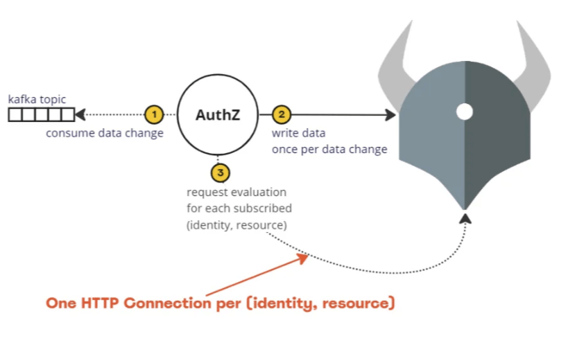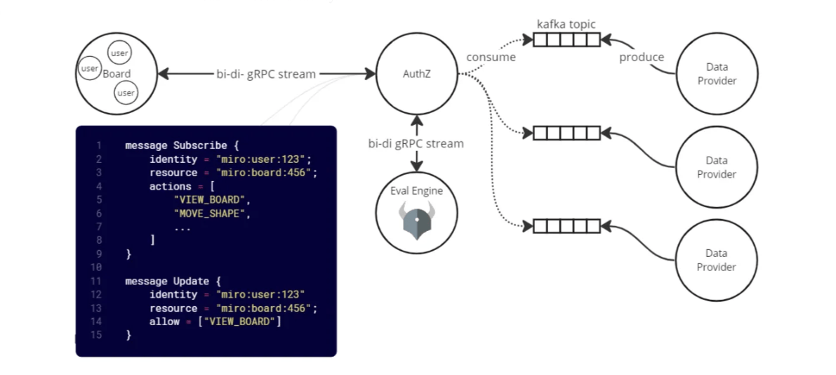 That’s how the team came up with the “streaming architecture,” which is a special operating mode for cases that need it, like on-board authorization. The idea is that clients “subscribe” to authorization changes over a bidirectional gRPC stream by specifying an identity, a resource, and a set of actions to track.