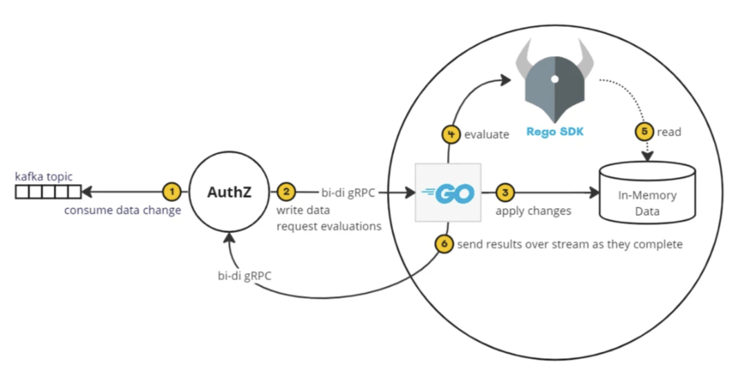 We decided to explore our own solution written in Go, which is very similar to “push data,” but uses a single bidirectional gRPC stream with protobuf messages instead of JSON, and stores data in-memory in what is basically just a hashmap. The stream connection only needs to be established once, and thanks again to the versatility of OPA, we were still able to offload all the complexity of policy evaluation by leveraging the Rego SDK.